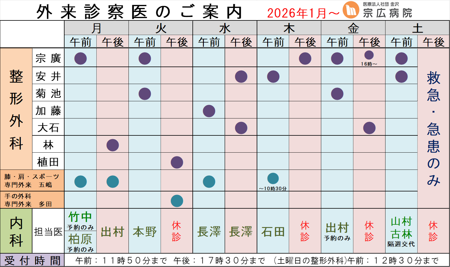1月から外来診療・担当医は以下の通りに変更となります。